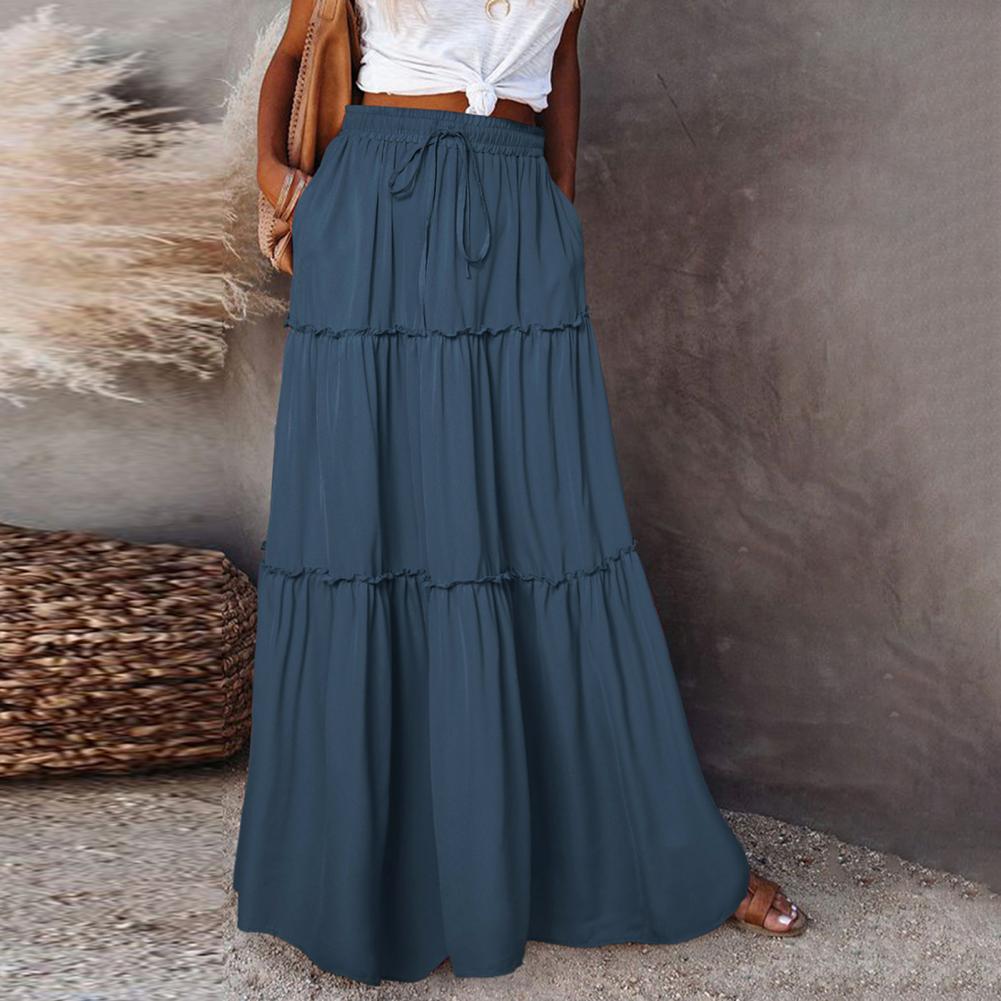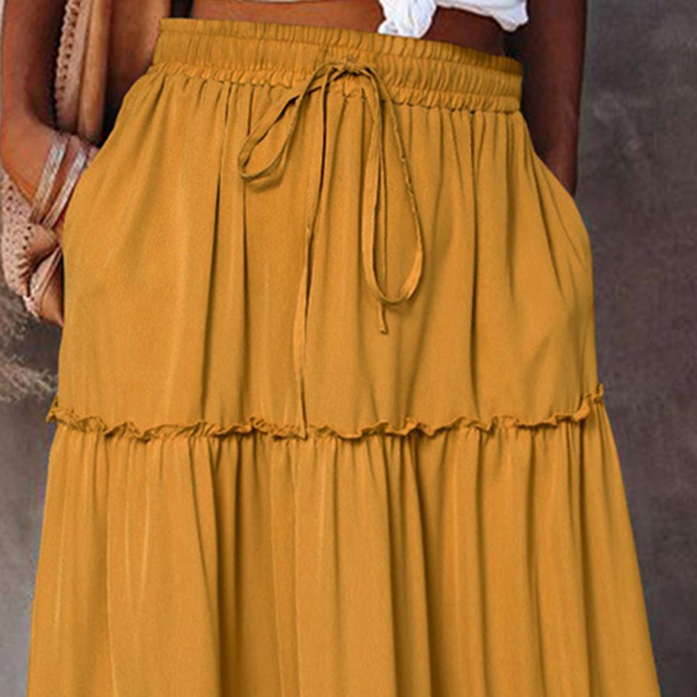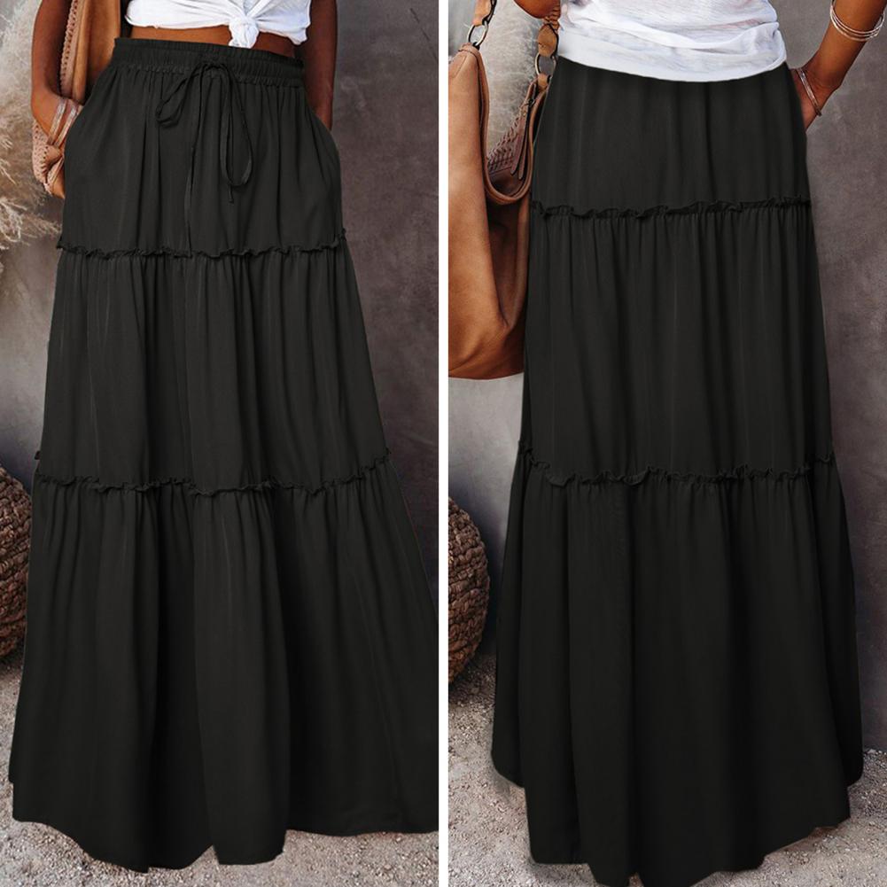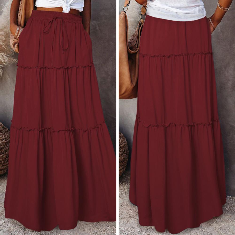 Waist Type: Natural Waist Skirt Length: Ankle-Length Aspect Ratio: A-Line Pattern Type: Solid Color Style: Casual Material: Polyester Fiber Gender: Female Color:Golden,Black,Blackish-green,Wine-red Size:S-XL..