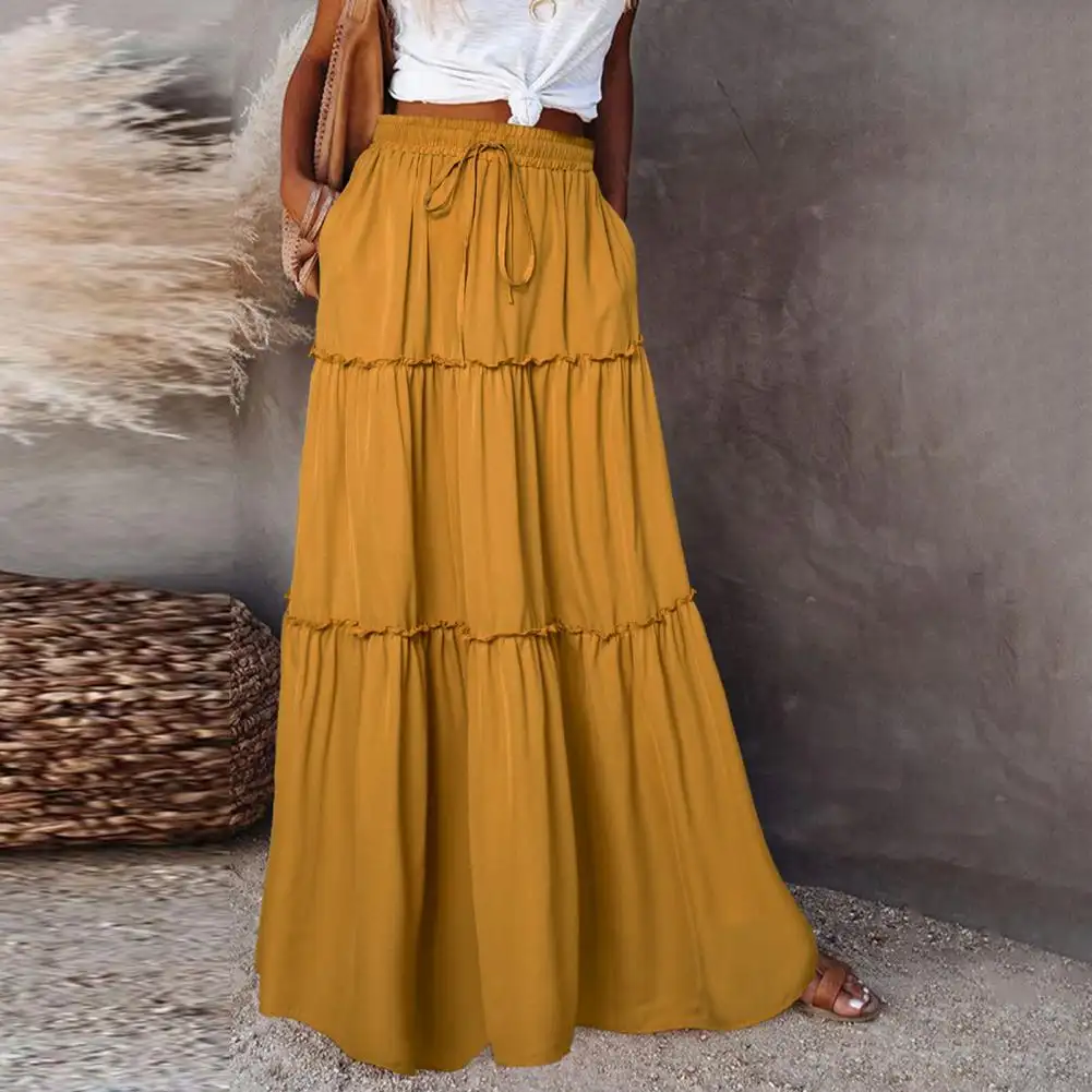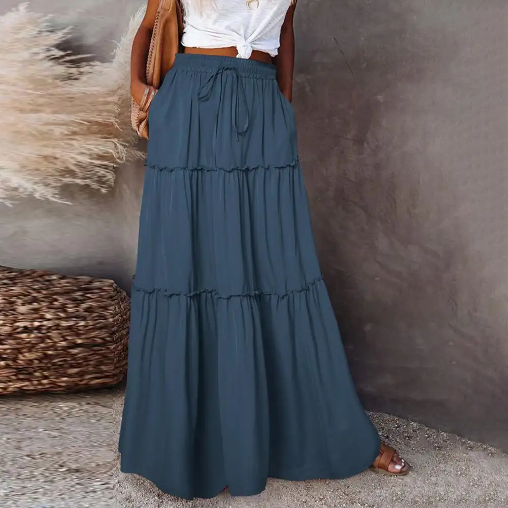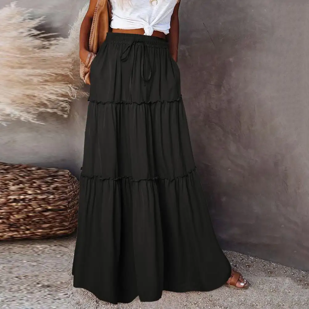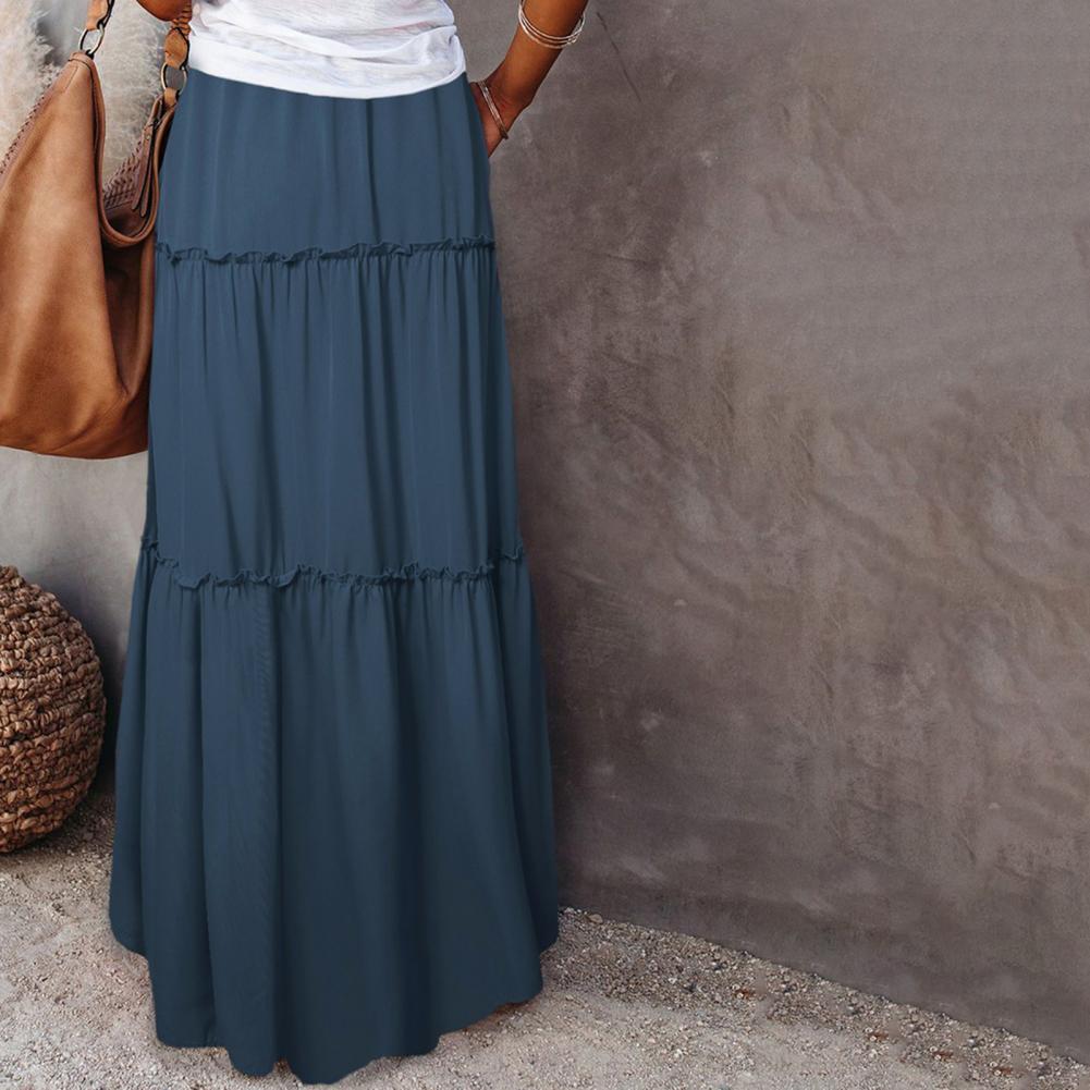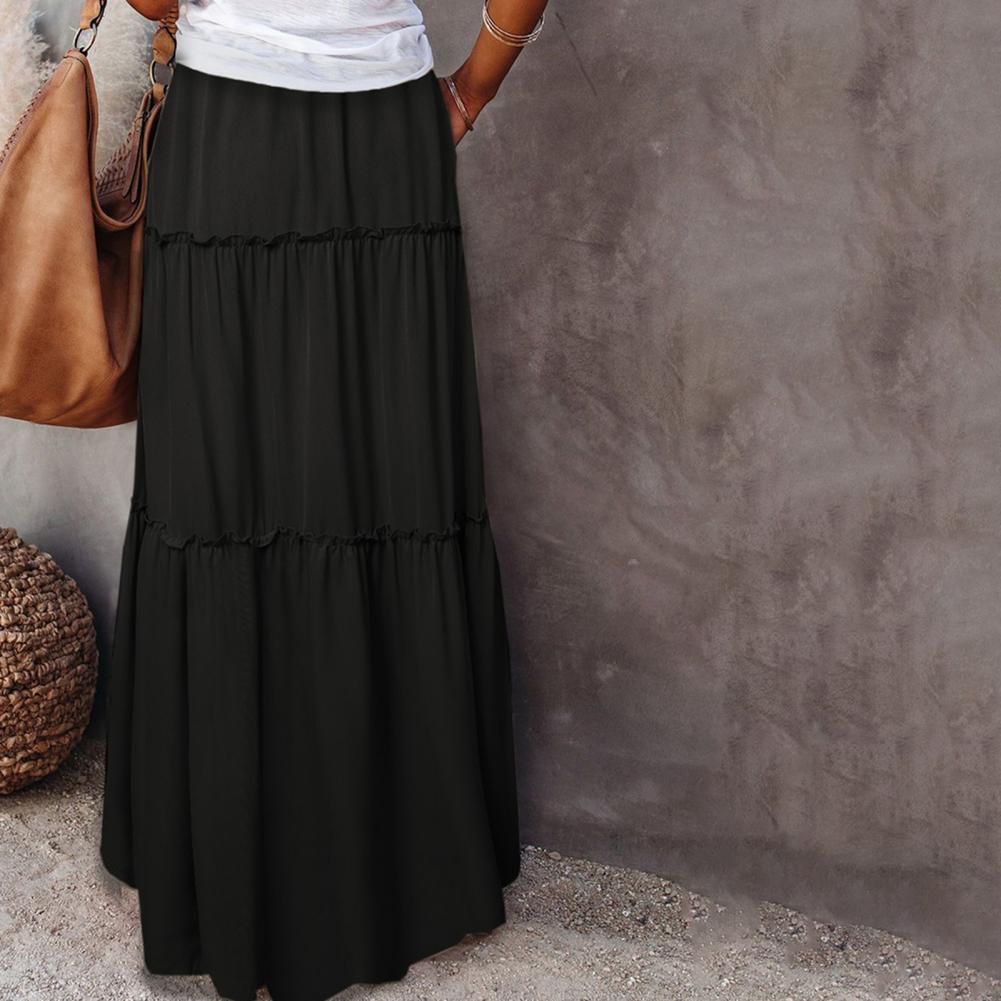 Waist Type: Natural Waist Skirt Length: Ankle-Length Aspect Ratio: A-Line Pattern Type: Solid Color Style: Casual Material: Polyester Fiber Gender: Female Color:Golden,Black,Blackish-green,Wine-red Size:S-XL..